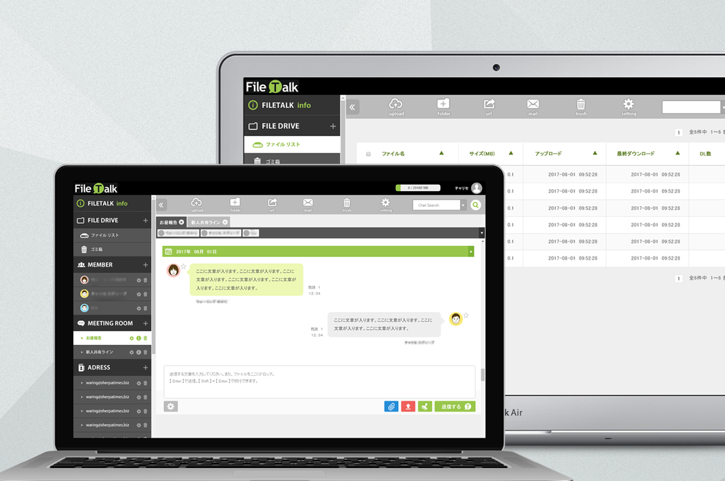 ファイルアップロード機能のほか、ドライブ共有やチャット機能、アドレス管理など “FileTalk”(ファイルトーク)には使いやすい便利な機能が満載です。